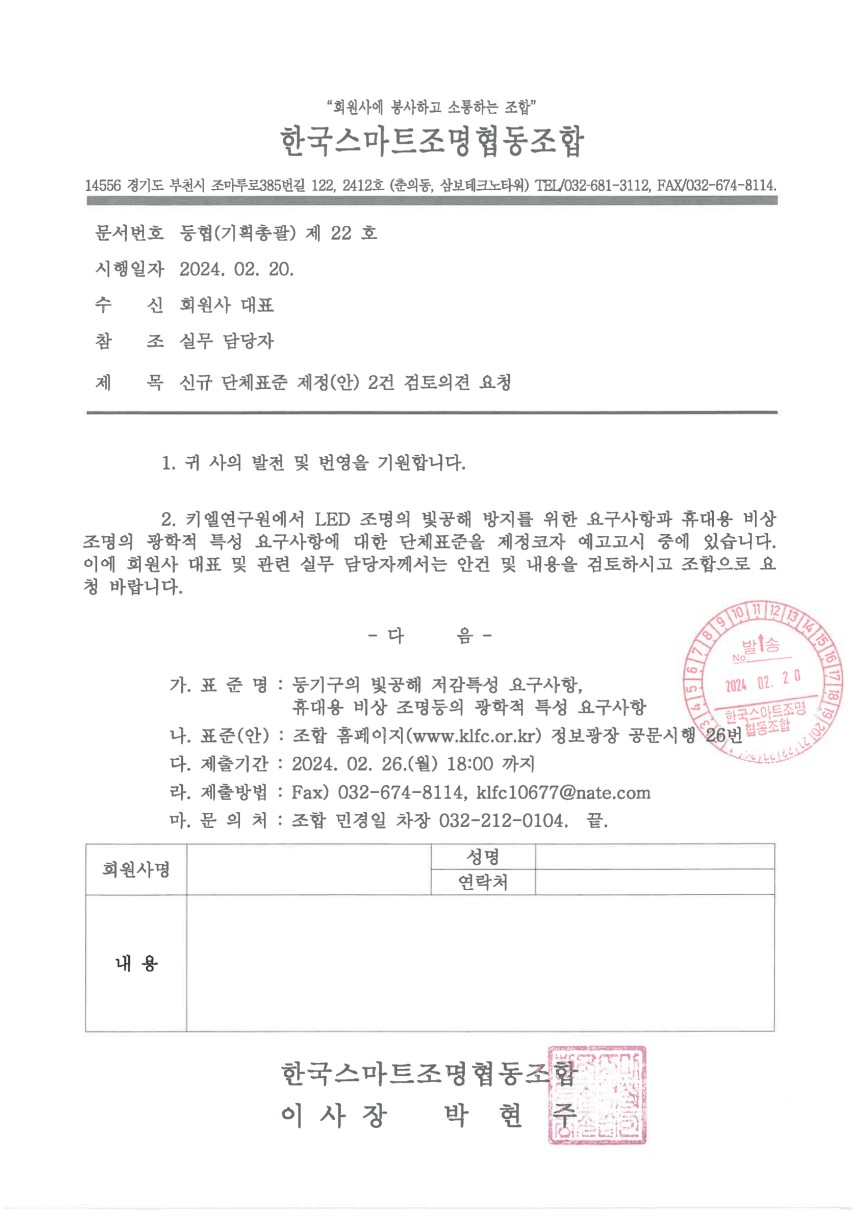 신규 단체표준 제정(안) 2건 검토의견 요청 페이지 정보 작성자스마트조명조합 조회 64회 작성일 2024-02-21 16:32:00 댓글 0 list_alt목록 본문 신규 단체표준 제정(안) 2건 검토의견 요청드립니다 이전글 24년 상반기 산업안전상생 안전보건 아카데미 사전접수 안내 다음글세계 최첨단 조명기술 일본에 모였다 arrow_back arrow_forward list_alt 댓글 0 등록된 댓글이 없습니다.